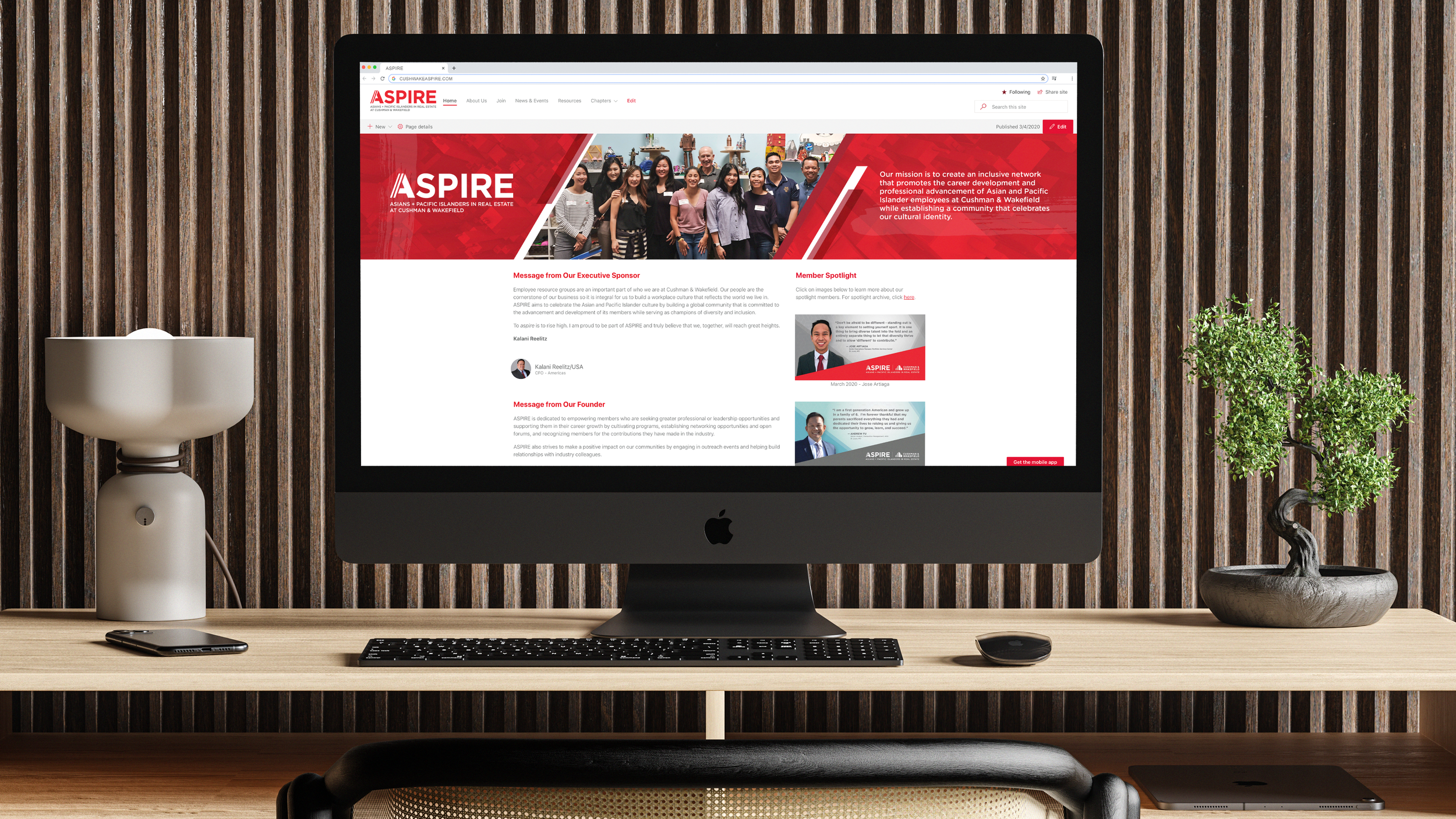 For Cushman & Wakefield’s Asian + Pacific Islander employee resource group, a distinct style was created for ASPIRE’s overall design standards and core brand assets. The design, which celebrated API heritage, featured as the foundation of the group’s marketing materials, including a global intranet site built with SharePoint, comprehensive social media campaigns, presentation for ASPIRE’s virtual town hall event, and marketing collateral created to spread awareness of the launch of the group.